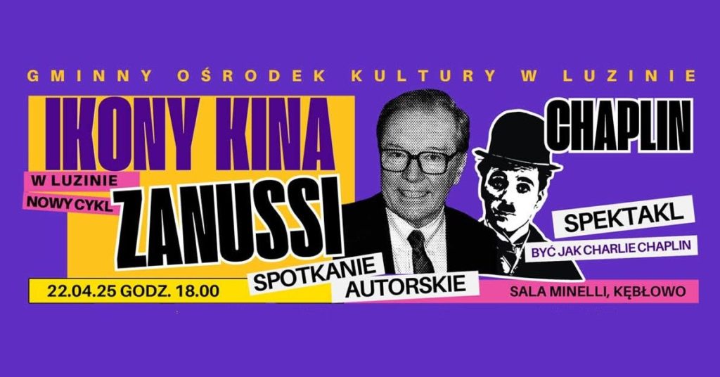 Zapraszamy na niezwykły wieczór w gminie Luzino. Z okazji 780-lecia Luzina rozpoczyna się cykl wydarzeń kulturalnych. Jednym z nich będzie rozmowa z Krzysztofem Zanussim oraz pokaz spektaklu Fundacji Pomysłodalnia „Być jak Charlie Chaplin”.